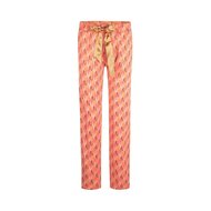Deze roze pyjamabroek heeft een mooie satijnen strik en een all-over fantasie print in roze, camel en steenrood. De pijpen van deze katoenen Charlie Choe dames broek uit het Flower Power Days thema lopen aan de onderzijde recht. Kleur: multi Kwaliteit: 95% katoen, 5% elastaan