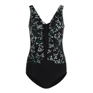Het badpak is aan de bovenzijde tot aan de taille bedrukt met charmante bloemetjes, waardoor een levendig patroon ontstaat dat een vleugje jeugdige elegantie toevoegt aan het ontwerp. Terwijl de bovenkant van het badpak een levendige uitstraling heeft, is de onderkant effen zwart. Deze combinatie van print en effen kleur zorgt voor een gebalanceerde en toch opvallende look. De effen zwarte onder- en achterzijde voegt een vleugje eenvoud en tijdloze klasse toe aan het badpak. Of je nu aan het zwembad zont of in de zee zwemt, het Mila badpak biedt niet alleen de benodigde functionaliteit maar ook een modieuze twist. Voel je zelfverzekerd en straal in dit prachtige badpak tijdens al je zwemavonturen. Kleur: Black/OffWhite Kwaliteit: 80% polyamide, 20% elastan
