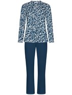 Comfort en stijl komen samen in deze vrouwelijke pyjama, vervaardigd van 100% ademend katoen. De pyjama is uitgevoerd met een zachte halslijn die elegant overgaat in een gedeeltelijke knoopsluiting – praktisch én charmant. De witte ondergrond wordt verfraaid met een delicate blauwe bloemenprint, voor een frisse en tijdloze uitstraling. De bijpassende uni blauwe broek is tijdloos. Deze pyjama combineert comfort met een mooi design en is perfect voor wie ’s nachts ook graag stijlvol voor de dag komt. Kleur: 520 dark blue Kwaliteit: 100% katoen