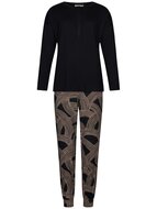 Deze stijlvolle Pastunette Premium pyjama biedt een perfecte mix van comfort en elegantie. Het zwarte shirt is voorzien van een gedeeltelijke knoopsluiting, wat zorgt voor een subtiele, klassieke uitstraling. De lange broek met moderne grafische print geeft een speelse twist aan het geheel. Gemaakt van duurzame Ecovero™ viscose, een milieuvriendelijk materiaal dat bekend staat om zijn zachtheid, ademend vermogen en soepele val. Een ideale keuze voor wie bewust kiest voor kwaliteit én duurzaamheid. Perfect voor ontspannen avonden en comfortabele nachten, met een luxueuze uitstraling die je van Pastunette mag verwachten. Kleur: 999 black Kwaliteit: 95% ecovero viscose, 5% elastaan