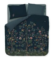 Het Il Paradiso-dessin heeft een landschap met hoge sierlijke bomen, waaraan weelderige bladeren en fantasierijke bloemen groeien. Hier en daar houdt een vogel zich schuil tussen de bladeren. De kussenslopen en het dekbedovertrek hebben een doorgestikte oxford rand aan de zijkanten en zijn afgewerkt met een ronde bies, daarnaast hebben de kussenslopen een unieke striksluiting dit alles geeft het dekbedovertrek en de kussenslopen een extra rijke en luxe uitstraling. De achterkant van het dekbedovertrek en de kussenslopen hebben een print van blaadjes, waardoor het dubbelzijdig gebruikt kan worden. Dit geeft een speels mix&match-effect op je bed. Dit dekbedovertrek is er in verschillende maten en heeft een instopstrook. Kleur: dark blue Kwaliteit: 100% percale katoen (200 TC)
