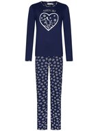 Comfort en stijl komen samen in deze prachtige Rebelle damespyjama. Het donkerblauwe bovenstuk is voorzien van een speelse Aspen Ski-opdruk, die zorgt voor een winterse en sportieve uitstraling. De lange broek is bedrukt met een charmant hartjespatroon, wat het geheel een vrouwelijke en gezellige touch geeft. Gemaakt van zachte materialen voor ultiem draagcomfort tijdens koude nachten. Perfect voor een ontspannen avond op de bank of een knusse winterslaap. Kleur: 520 - Dark Blue Kwaliteit: 100% katoen