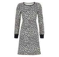 Dit nachthemd uit de Ringella Bloomy collectie straalt een stoere en vrouwelijke stijl uit dankzij de opvallende panterprint met donkerblauwe en roze accenten. Het nachthemd heeft lange mouwen die zijn afgewerkt met een manchet voor een nette en comfortabele pasvorm. De ronde hals is voorzien van een donkerblauwe bies, wat zorgt voor een subtiel contrast en een verzorgde afwerking. De all-over print geeft het nachthemd een trendy en levendige uitstraling, perfect voor wie graag stijlvol en comfortabel de nacht ingaat. Kleur: 579 - North Atlantic Kwaliteit: 95% katoen, 5% elastan Lengte: ca. 95 cm.