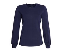 Deze top heeft een klassieke ronde hals met een zachte gebreide boord. De mouwen, eveneens met bijpassende gebreide boorden, zorgen voor een comfortabele pasvorm. De licht afgeronde zoom geeft het T-shirt een vrouwelijk silhouet en rondt het ontwerp harmonieus af. Gemaakt van hoogwaardig katoen met elastaan in single jersey kwaliteit, biedt het T-shirt een comfortabele pasvorm en optimale bewegingsvrijheid. Het effen design maakt het een veelzijdige basic die gemakkelijk te combineren is met al onze broeken. Kleur: 214 - Night Blue Kwaliteit: 95% katoen, 5% elastan Lengte Shirt: ca. 65 cm.