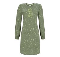 Comfortabel Ringella dames nachthemd met ronde hals. De lange mouwe hebben manchetten. De voorzijde is versierd met de inspirerende tekst 'You make me happy'. Het nachthemd is ontworpen met een allover print van lichter groene spots op een donker groene ondergrond, wat zorgt voor een frisse uitstraling. Kleur: 568 - Green Kwaliteit: 100% katoenen tricot (jersey) Lengte: ca. 95 cm