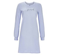 Dit nachthemd uit de damescollectie van Ringella is stijlvol in zijn eenvoud en straalt een moderne charme uit. Het model heeft een ronde hals met een subtiele inkeping en lange mouwen met manchetten voor een nette afwerking. Het nachthemd is uitgevoerd in een uni kleur en voorzien van een speelse frontprint met de tekst “Love your self”. De zachte materialen zorgen voor optimaal draagcomfort, perfect voor ontspannen nachten en relaxte momenten thuis. Een mooie mix van comfort, stijl en een positieve boodschap. Kleur: 226 Light Blue Kwaliteit: 100% katoen Lengte: ca. 95 cm.