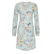 Dit stijlvolle nachthemd van Ringella combineert comfort met een charmant design. Het model heeft een ronde hals die doorloopt in een halve knoopsluiting. De lange mouwen zijn afgewerkt met een manchet en knoopsluiting voor een elegante touch. Het geheel wordt verfraaid door een allover print met bloemen en vogels, die het nachthemd een frisse en vrouwelijke uitstraling geeft. Gemaakt van zachte, huidvriendelijke stof voor een comfortabele nachtrust. Deze nachtkledingcollectie draagt het FKT-label, wat betekent dat de kleding uitvoerig is getest op veiligheid, huidvriendelijkheid en de afwezigheid van schadelijke stoffen. Een verantwoorde keuze voor wie een gevoelige huid heeft of bewust kiest voor textiel dat zacht en veilig is voor de huid. Kleur: 980 Multi Kwaliteit: 50% katoen, 50% Modal Lengte : ca. 95 cm.