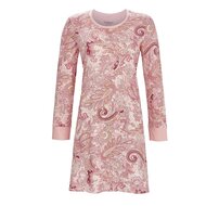 Dit nachthemd voor dames is een comfortabele keuze voor ontspannen nachten. Het heeft een klassieke ronde halslijn, versierd met elegante contrasterende biezen, wat het nachthemd een bijzondere touch geeft. De lange mouwen zijn voorzien van een contrasterende biezen voor een harmonieuze en modieuze look. Het aantrekkelijke paisley-dessin voegt een vleugje elegantie toe en straalt een vrolijke sfeer uit. Gemaakt van een hoogwaardige katoen-modalmix in single jersey-kwaliteit, voelt het nachthemd bijzonder zacht en comfortabel aan op de huid. De ademende materiaalcombinatie garandeert optimaal comfort, of u nu slaapt of thuis ontspant. Stijl en comfort komen hier samen. Kleur: 637 paradise pink Kwaliteit: 50% katoen, 50% modal Lengte : ca. 95 cm.