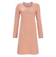 Dit damesnachthemd van Ringella is een stijlvolle en speelse keuze dankzij het opvallende pantherthema. Het nachthemd heeft lange mouwen en een ronde hals, beide afgezet met een panterprint bies die zorgt voor een stoere, modieuze touch. Op de voorzijde zijn twee kersen in panterstijl afgebeeld, wat het ontwerp een verrassend en trendy accent geeft. Met een lengte van circa 95 cm biedt het nachthemd een comfortabele pasvorm en voldoende bedekking voor een ontspannen nachtrust. Ideaal voor wie houdt van een vrouwelijke look met een vleugje lef. Deze nachtkledingcollectie draagt het FKT-label, wat betekent dat de kleding uitvoerig is getest op veiligheid, huidvriendelijkheid en de afwezigheid van schadelijke stoffen. Een verantwoorde keuze voor wie een gevoelige huid heeft of bewust kiest voor textiel dat zacht en veilig is voor de huid. Kleur: 838 - Teerose (poeder rose) Kwaliteit: 95% katoen Lengte: ca. 95 cm.