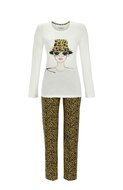 Deze damespyjama uit de nachtkledingcollectie van Ringella Women is een echte eyecatcher met een modieuze en speelse uitstraling. Het shirt heeft lange mouwen en een ronde hals en is op de voorzijde bedrukt met een opvallend dessin van een vrouw met een panterprint hoedje, zonnebril en paarse lippen – een echt beautymodel met flair. De lange, rechte broek maakt de look compleet met een bijpassende panterprint, identiek aan het hoedje op het shirt. Deze pyjama combineert comfort met een opvallend design en is perfect voor wie ’s nachts ook graag stijlvol voor de dag komt. Deze nachtkledingcollectie draagt het FKT-label, wat betekent dat de kleding uitvoerig is getest op veiligheid, huidvriendelijkheid en de afwezigheid van schadelijke stoffen. Een verantwoorde keuze voor wie een gevoelige huid heeft of bewust kiest voor textiel dat zacht en veilig is voor de huid. Kleur: 130 - Champagne Kwaliteit: 100% katoen Lengte Shirt: ca. 65 cm.