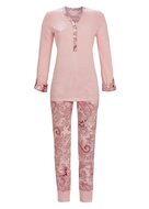Deze pyjama combineert stijl en comfort op een fantastische manier, ideaal voor ontspannen nachten. De pyjama heeft een halslijn met elegante contrasterende biezen en een praktische knoopsluiting, waardoor je hem gemakkelijk aan- en uitkleedt en tegelijkertijd een modieuze touch toevoegt. De lange mouwen zijn voorzien van knoopsluitingen, zodat je ze kunt oprollen. Het delicate strepenpatroon op de top en de trendy broek met paisleymotief en gestreepte boorden geven de pyjama een tijdloze elegantie en een frisse look. Gemaakt van hoogwaardig katoen-modal, voelt hij bijzonder zacht en comfortabel aan op de huid. De ademende materiaalcombinatie garandeert een optimaal comfort, of je nu slaapt of thuis ontspant. Kleur: 637 paradise pink Kwaliteit: 50% katoen, 50% modal Lengte shirt : ca. 68 cm.