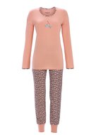 Deze damespyjama van Ringella is een echte eyecatcher met een speels pantherthema. Het shirt heeft lange mouwen en een ronde hals, beide verfijnd afgewerkt met een panterprint bies die het geheel een stoere uitstraling geeft. Op de voorkant van het shirt zijn twee kersen afgebeeld in panterstijl, wat zorgt voor een verrassend en modieus detail. De lange broek is volledig uitgevoerd in panterprint en heeft comfortabele, effen boorden aan de broekspijpen voor een goede pasvorm. Deze pyjama combineert stijl met comfort en is perfect voor wie houdt van een opvallende en trendy look in huis. Deze nachtkledingcollectie draagt het FKT-label, wat betekent dat de kleding uitvoerig is getest op veiligheid, huidvriendelijkheid en de afwezigheid van schadelijke stoffen. Een verantwoorde keuze voor wie een gevoelige huid heeft of bewust kiest voor textiel dat zacht en veilig is voor de huid. Kleur: 838 - Teerose (poeder rose) Kwaliteit: 100% katoen Lengte Shirt: ca. 65 cm.