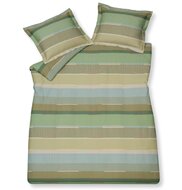 Het Optimist smoke green dekbedovertrek heeft brede horizontale stroken en verticale lijnen in verschillende tinten groen, bruin, blauw, geel, roze en rood. De achterkant van het dekbedovertrek heeft dezelfde print net als de kussens. Optimist smoke green dekbedovertrek van Vandyck voegt, met het kleurrijke lijnenspel, een vleugje moderne elegantie toe aan je slaapkamer. Het dekbedovertrek is van 100% katoen-satijn.